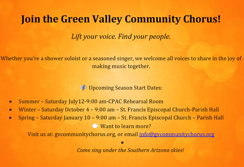 The Green Valley Community Chorus is composed of up to 90 enthusiastic voices from the Southern Arizona communities of and around Green Valley.
